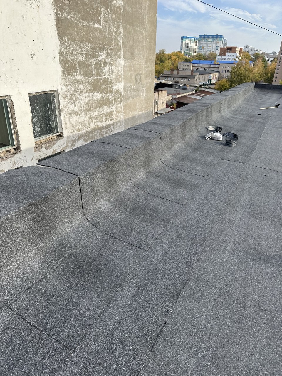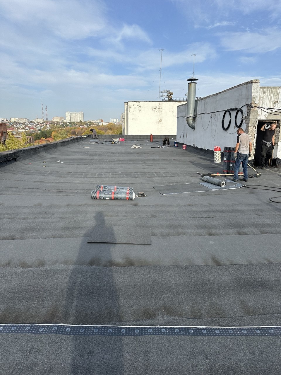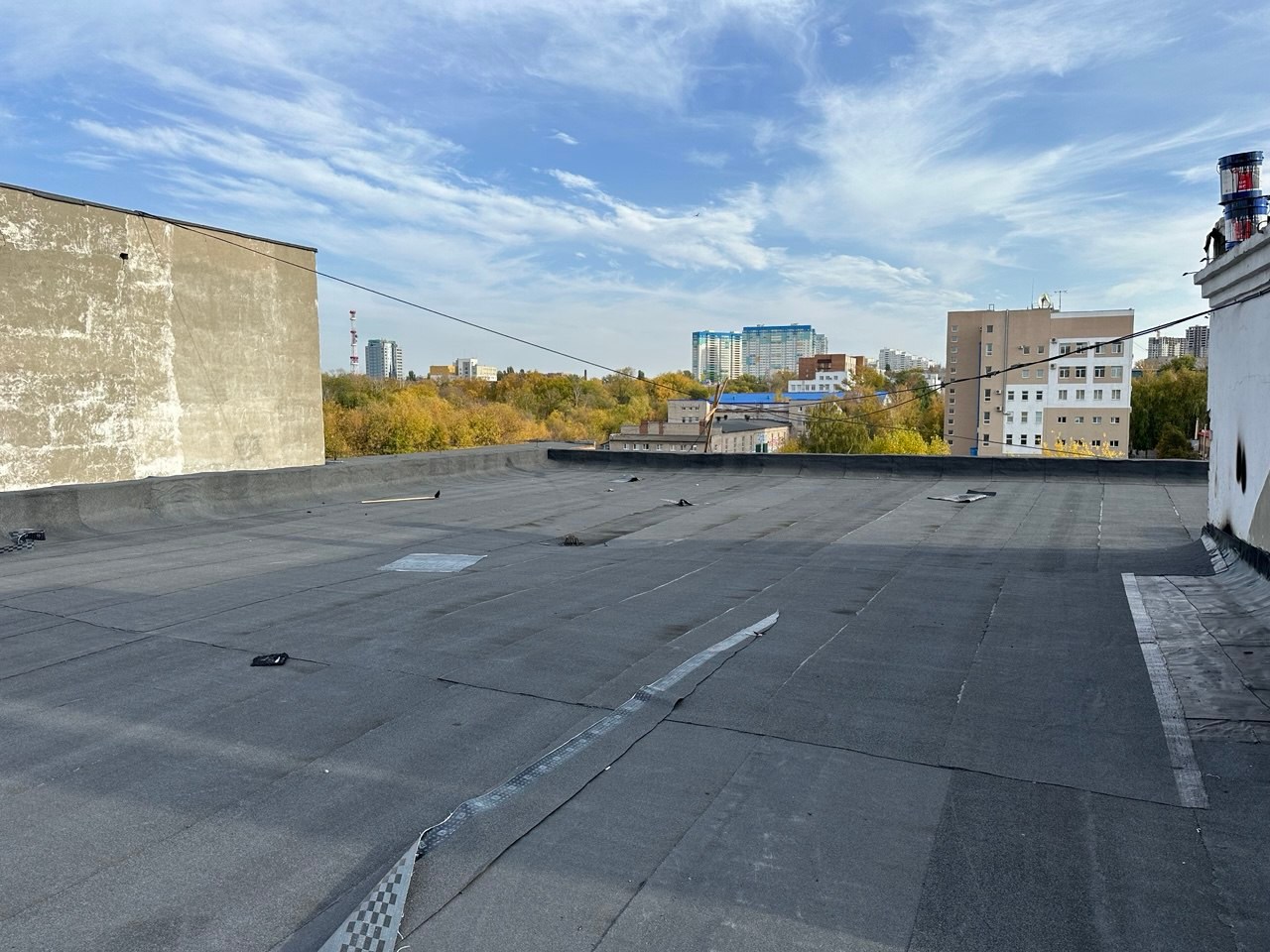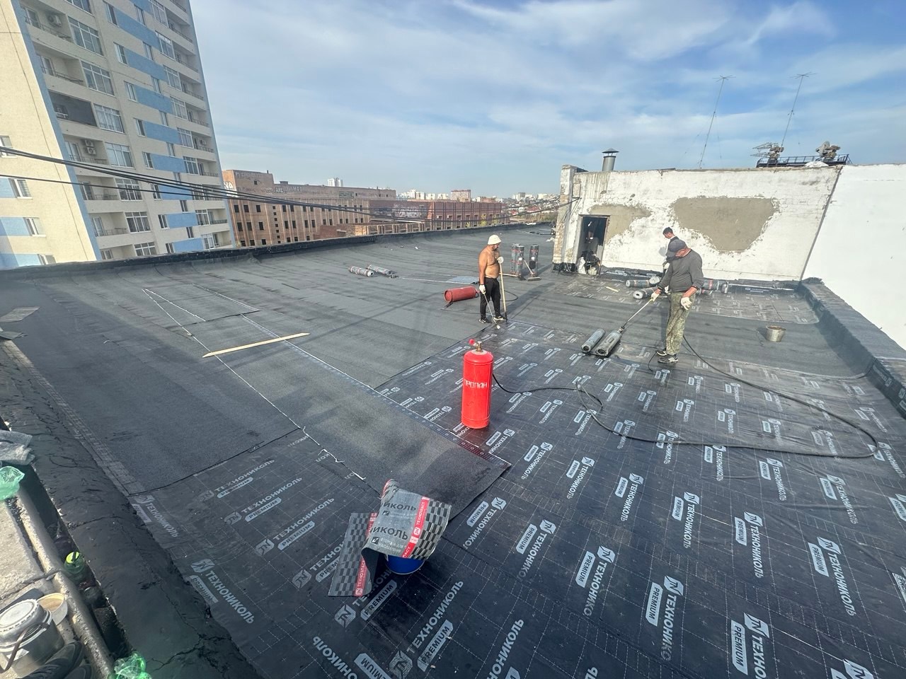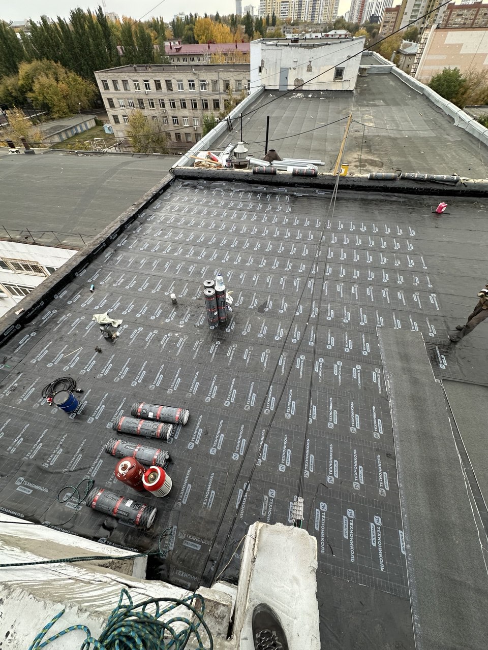 В ходе работ был выполнен демонтаж старого кровельного пирога, после чего основание подготовлено под устройство новой кровельной системы. Далее смонтированы пароизоляция и утеплитель, сформирована разуклонка для правильного водоотведения, установлены водосточные воронки и парапетные узлы.