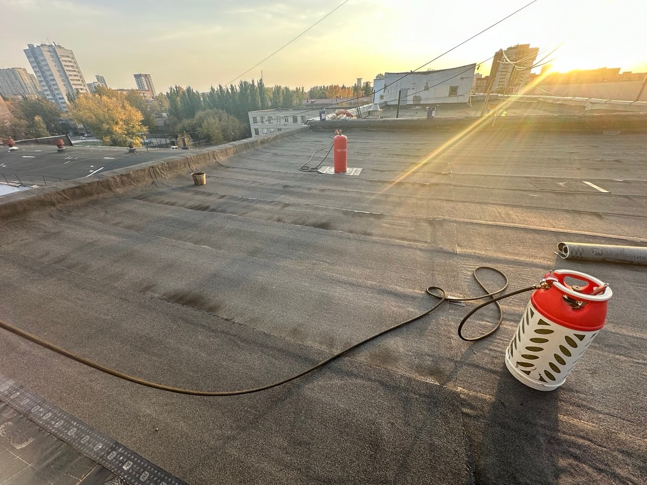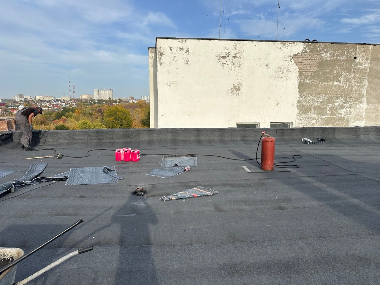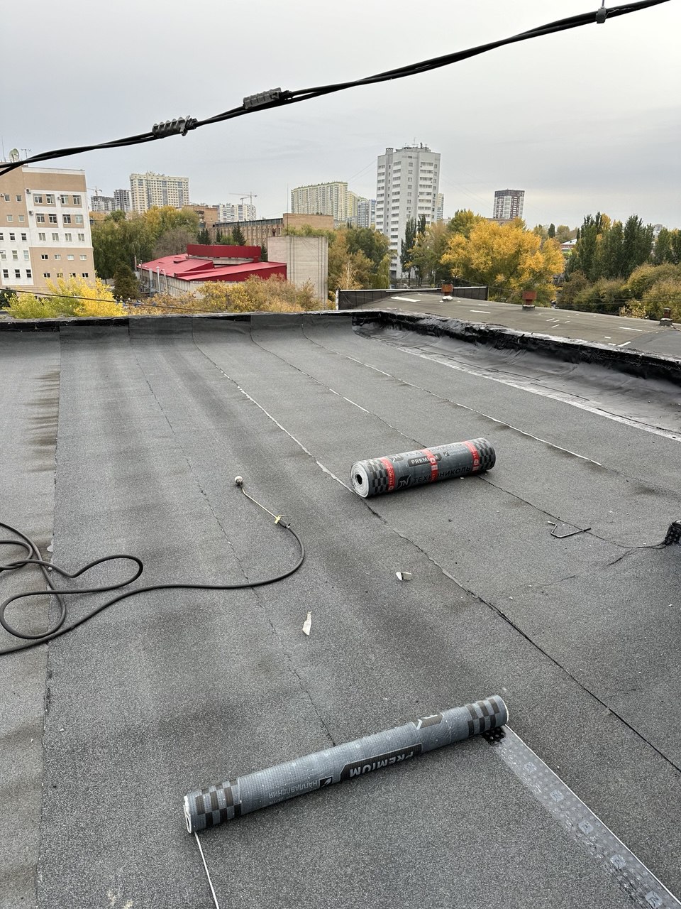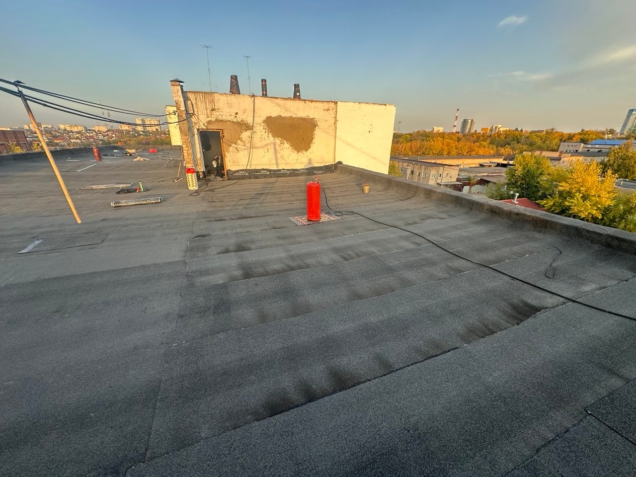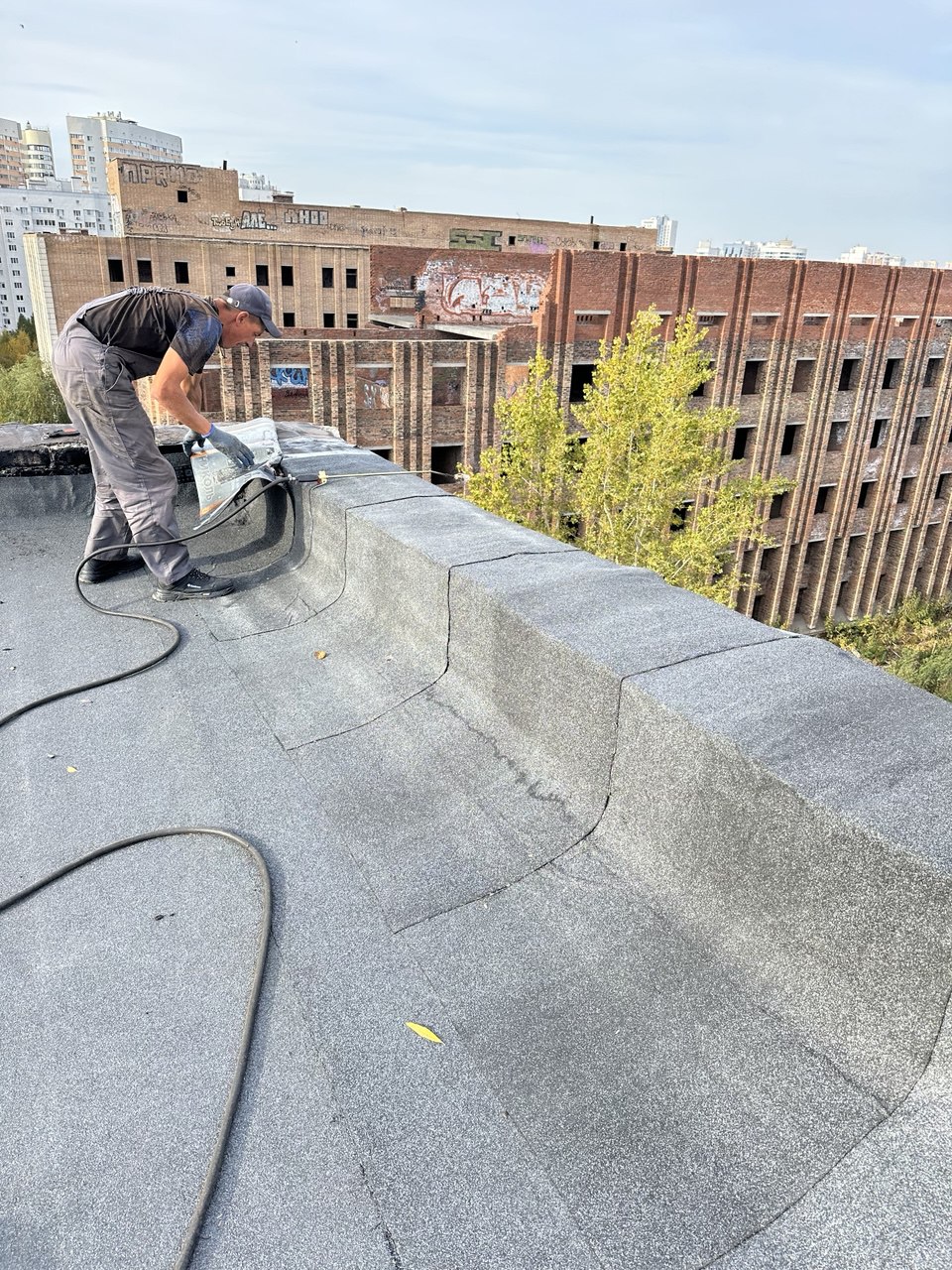 В ходе работ был выполнен демонтаж старого кровельного пирога, после чего основание подготовлено под устройство новой кровельной системы. Далее смонтированы пароизоляция и утеплитель, сформирована разуклонка для правильного водоотведения, установлены водосточные воронки и парапетные узлы.